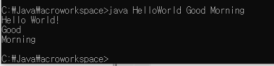 java HelloWorld args[0] args[1] args[2] … 이렇게 클래스명 뒤에 파라미터 값들을 한 칸 띄고 넣어주면 main 메소드에서 사용할 수 있다. 이 프로그램은 args[0]==Good, args[1]==Morning로 입력했다. 결과는 잘 나왔다.
