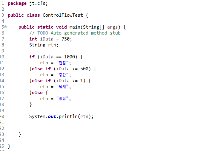 위에서 아래로 조건을 확인하면서 평가식이 true 가 나오면 해당 구문을 실행하고 if 문을 빠져나간다. 위 예문을 잘 확인하고 다양한 방식으로 연습하길 바란다.