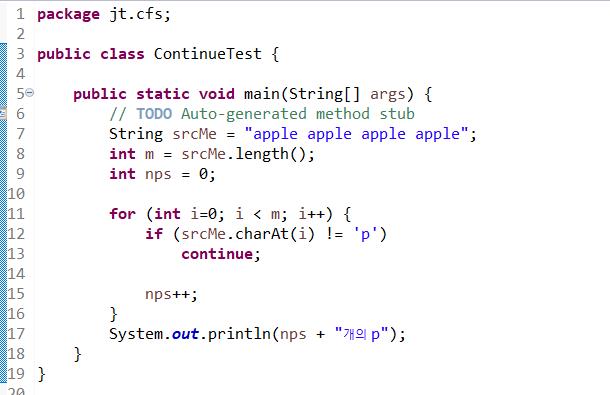 p가 몇 개인지 찾는 프로그램이다. 우선 for문을 통해 전제 srcMe 문자열의 길이만큼 순환한다. 우리가 찾는 것은 ‘p’이다. 그래서 p가 아니면 continue문에서 현재 순번을 건너 뛰고 다음 순번을 호출하는 방식이다.