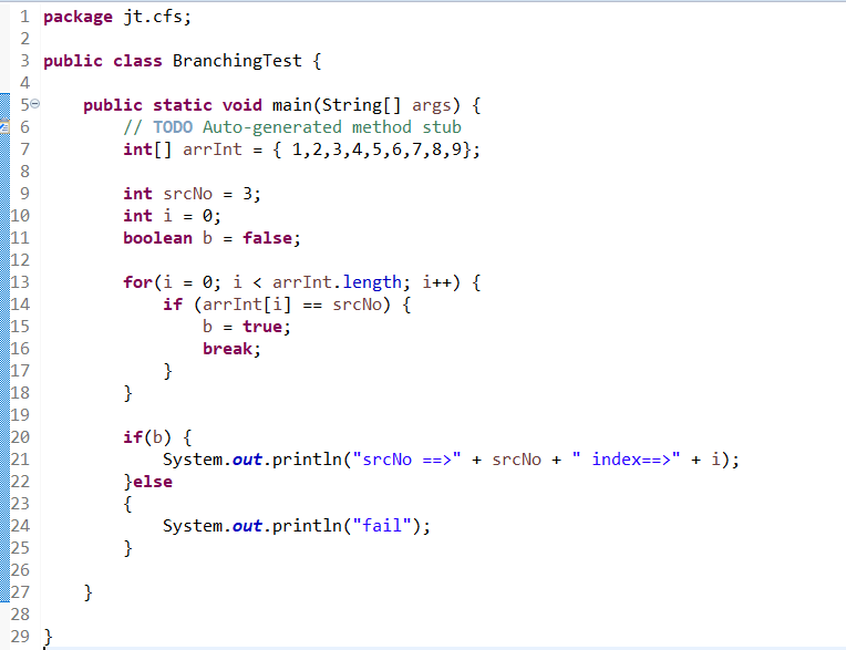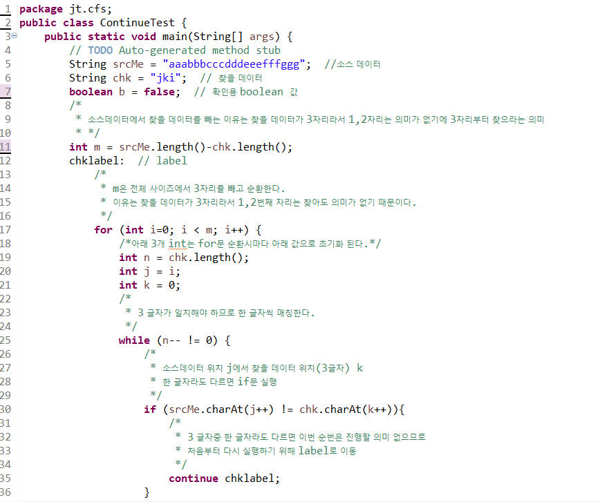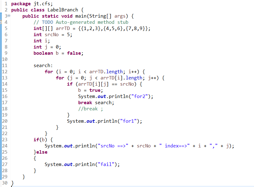 위 소스를 보면 search:라는 label 이 있다. 이정표 같은 것이다. Break search; 에서 이 위치로 이동하라고 하는 것이다. 만약 search가 없거나 break만 사용한다면 두 번째 for문만 빠져나가고 첫 번째 for문을 다시 실행하게 된다. 완전히 for 문을 나가고 싶다면 label을 이용하면 된다.