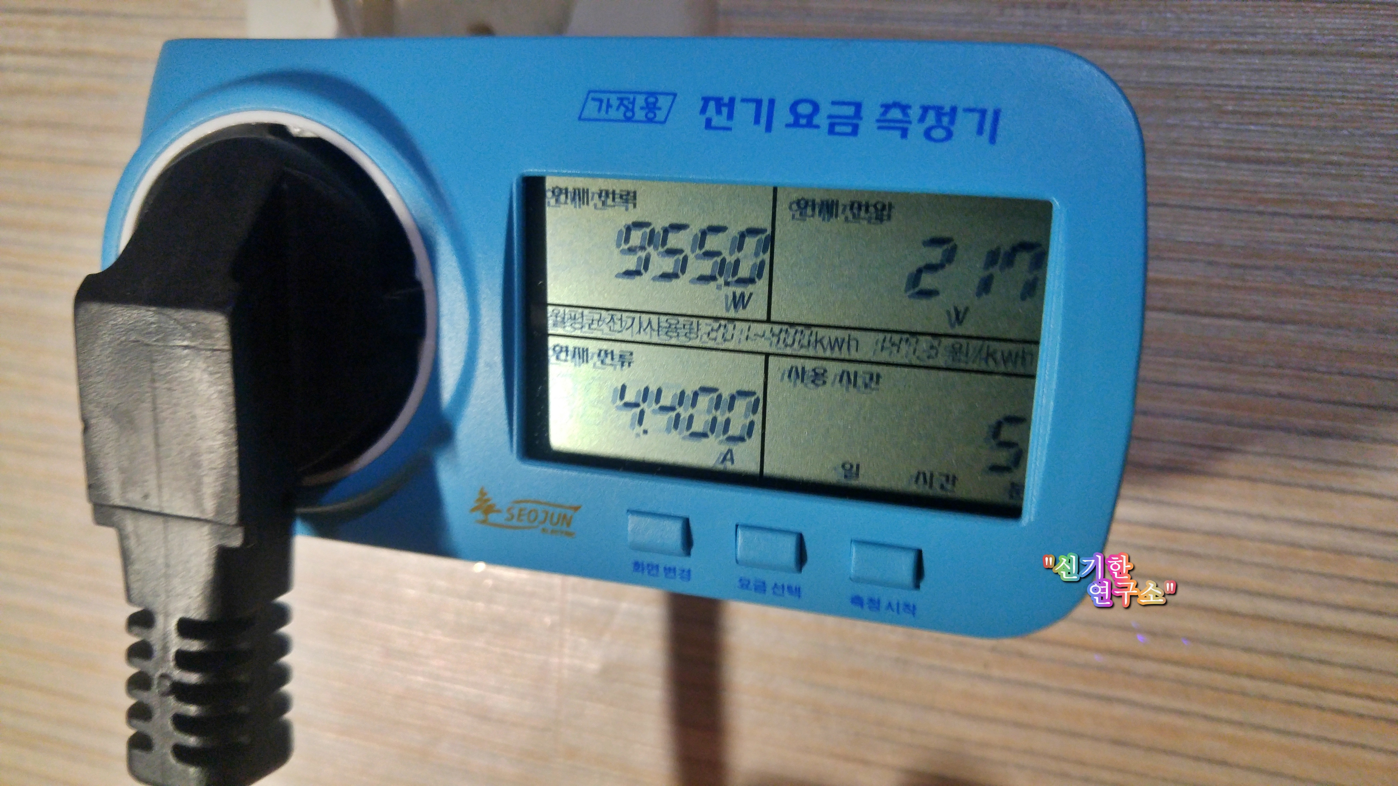 5분 사용을 했습니다. 현재 소비전력은 1단인 경우 955w입니다. 2500w에 반도 안되는군요. 전류는 4.4A입니다. 난방기로 전기세(전기요금)가 이 정도면 괜찮습니다.