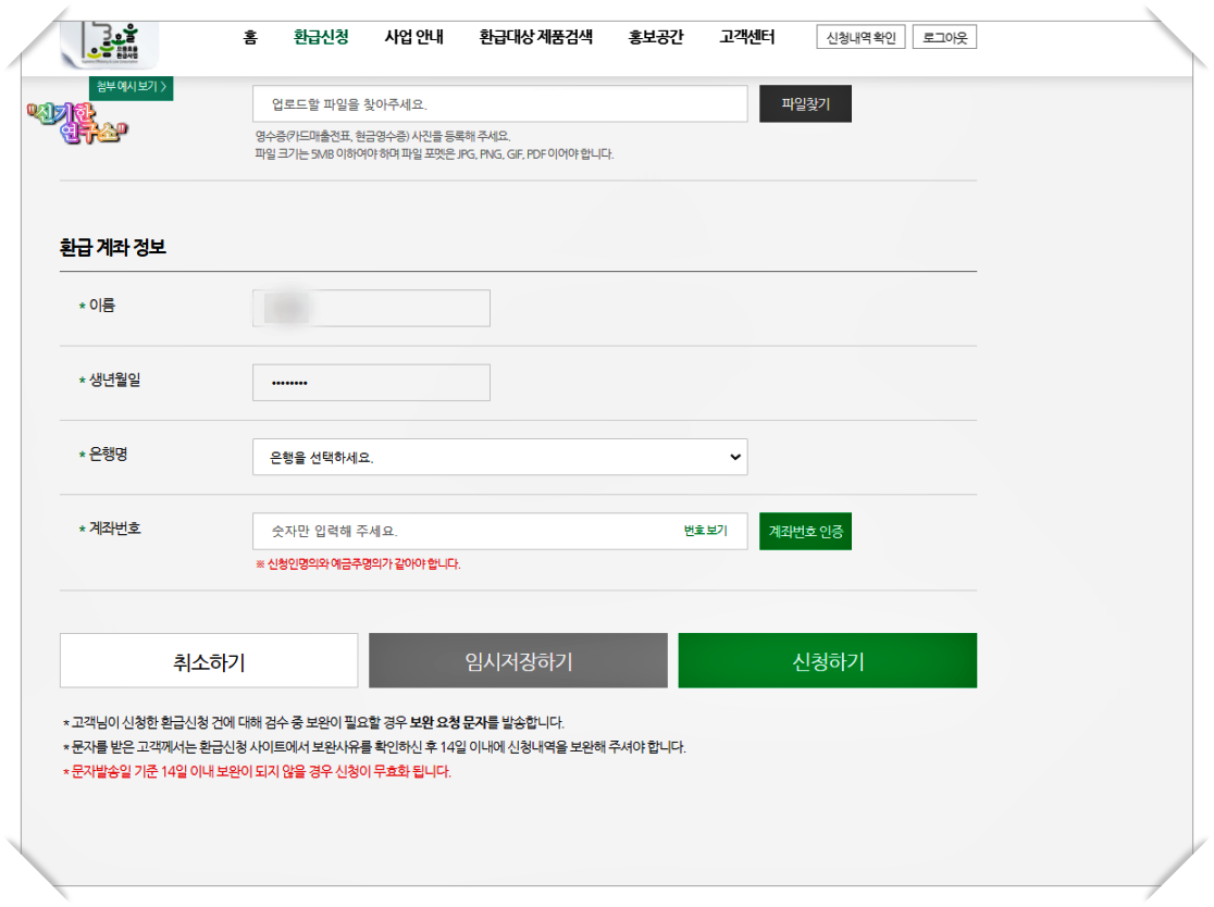 이제 돈을 환급받아야 하기에 은행과 계좌를 선택합니다.