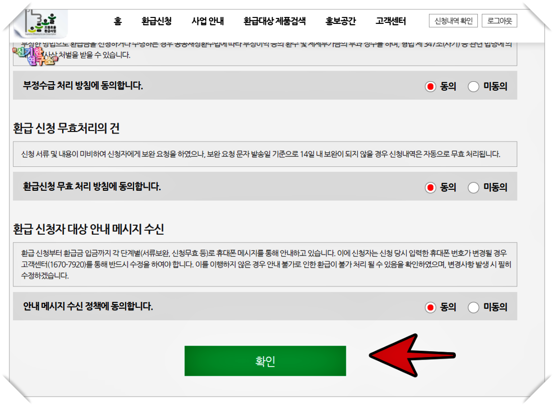 안 하면 환급처리 진행이 안되기에 전부 동의를 하고 확인을 클릭합니다.