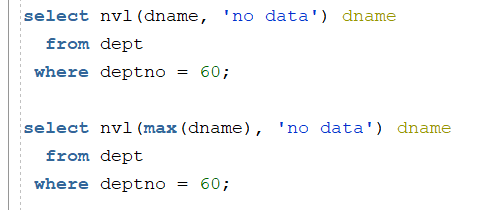 그래서 max() 또는 min() 함수를 사용해서 NULL을 리턴 받은 다음 nvl을 사용하면