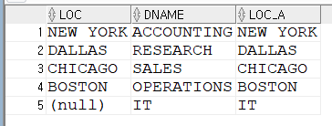 coalesce(loc, dname)으로 표현식을 만들었는데 5번째 loc값이 NULL이어서 그다음 dname값인 IT가 나온 것을