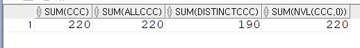 하지만 SUM(DISTINCT CCC)는 중복된 30을 하나만 인식해서