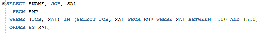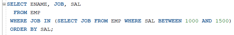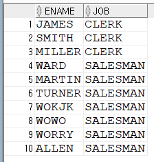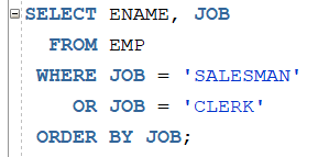 JOB이 ‘SALESMAN’ 과 ‘CLERK’를 조건으로 조회하고 싶은 경우 아래와 같이 작성합니다.