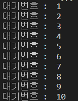 예측되는 결과는 "대기번호 : 1" ~ "대기번호 : 10"까지 쭉 출력될 듯합니다.