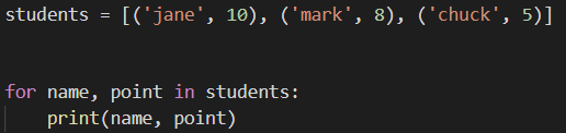 튜플로 값이 2개로 설정되어있지만 꺼낸값을 1개만 설정하면 ('jane', 10)처럼 튜플째 조회가 됩니다.