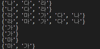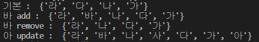 '가나다라'로 파이썬 set 집합을 만들었습니다.