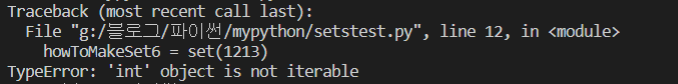 set은 반복되는 객체가 아닌 int를 지원하지 않기에 오류가 발생합니다.