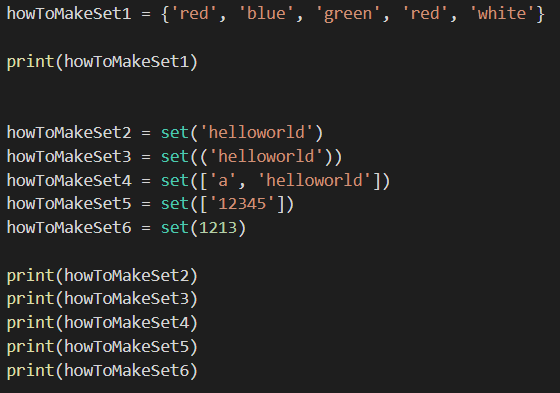 howToMakeSet1을 보시면 콤마로 구분된 데이터를 { }로 감싸고 있습니다.