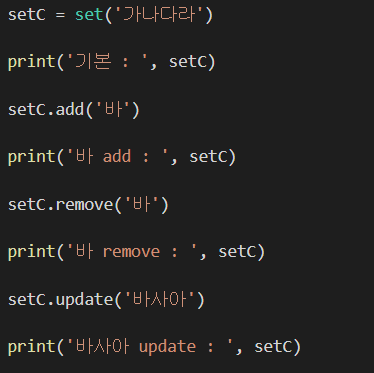 add 함수를 사용해서 set 집합에 '바'를 추가할 수 있습니다.
