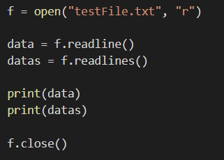 결과는 readline()는 첫줄이 나오고 readlines()는 리스트로 전체 데이터가 나왔습니다.