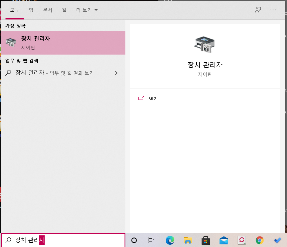 확인하는 방법은 화면 좌측 아래 검색창에 장치 관리자로 입력합니다.