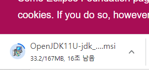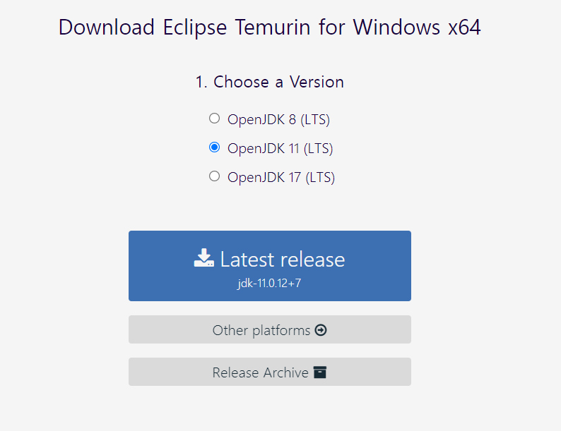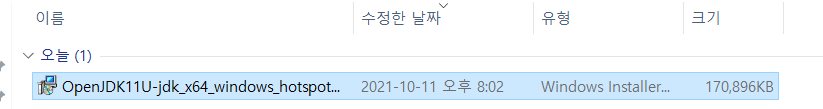 Latest release (jdk-11.0.12+7) 파란색 버튼을 클릭하면 다운로드가 시작된다.