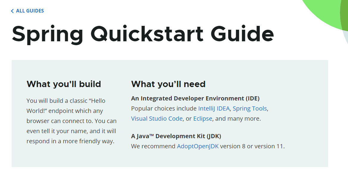 spring.io > learn > Quickstart에서 파란색 AdoptOpenJDK 글자를 클릭한다.