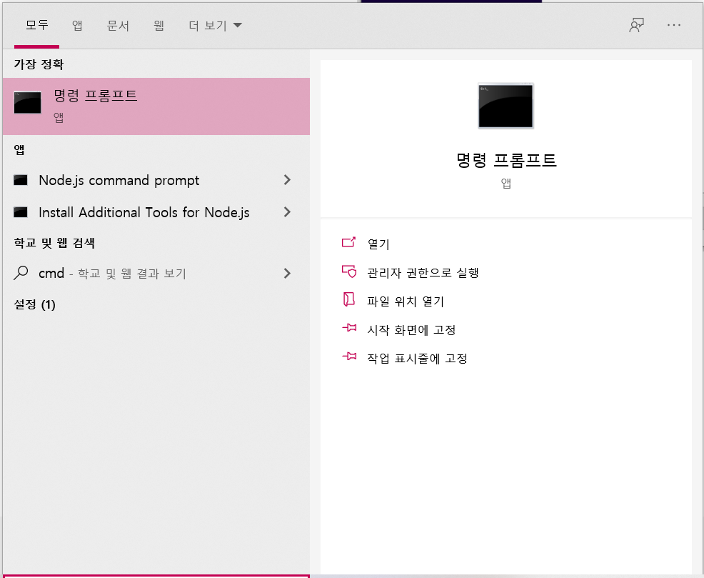 윈도우즈 우측 하단 "검색하려면 여기에 입력하십시오."에 cmd를 입력하고 실행합니다.