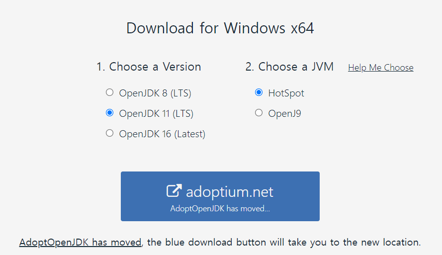 오라클의 JDK를 받으면 좋겠지만 여기서는 AdoptOpenJDK (오픈JDK) 8 또는 11버전을 권장한단다.