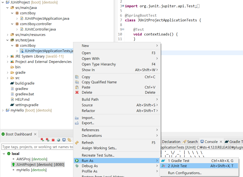 JUnitProjectApplicationTests.java에 우클릭해서 Run As를 선택하면 JUnit Test가 보인다.
