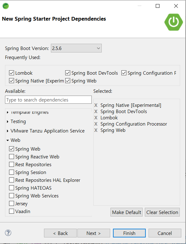 Dependencies는 위 사항으로 체크하고 Spring Web은 꼭 추가하자.
