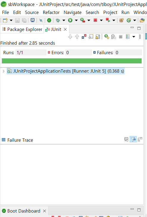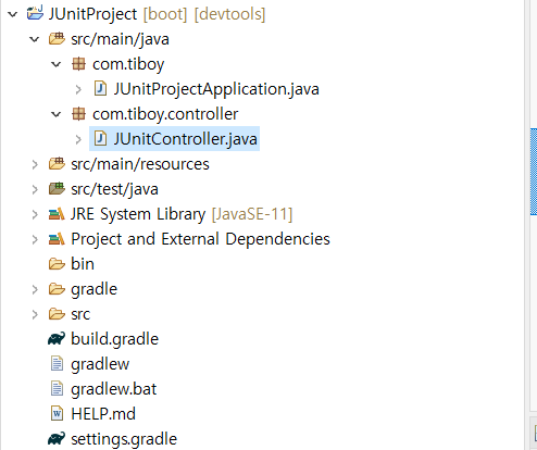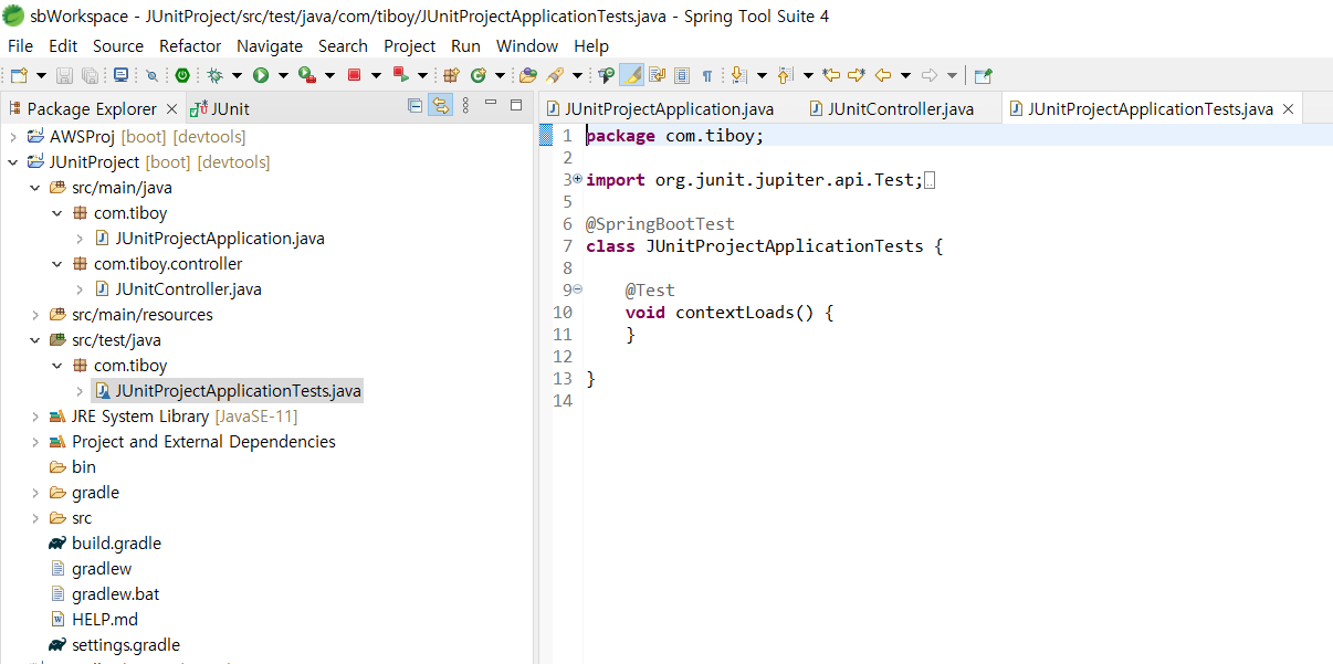 하위에 JUnitProjectApplicationTests.java가 자동으로 생성되었음을 확인하자.