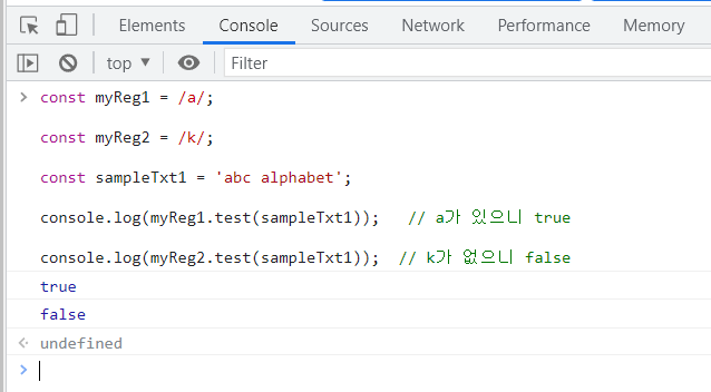console.log(myReg1.test(sampleTxt1)); // a가 있으니 true