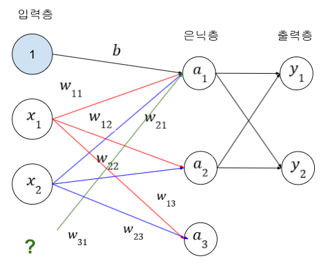x3가 없는데 x3에서 출발 a1에 도착하는 가중치 w31을 초록색으로 표현했다.