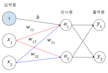입력층이 가중치(w)와 곱하고 편향을 더하면 은닉층의 a1, a2 값이 나온다.