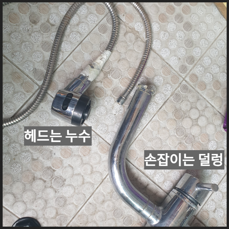 얼마 뒤 주방수전 헤드가 삭아서 물을 틀면 옆으로 튀고 호스를 따라 바닥으로 물에 샜다.