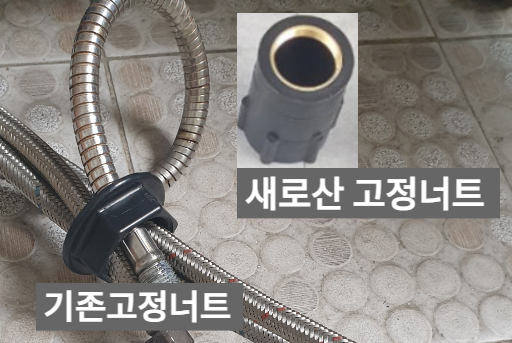 그리고 고정용 너트나 플라스틱으로 된 나사선 고정장치를 고무패킹, 금속패킹 다음으로 호스를 넣는다.