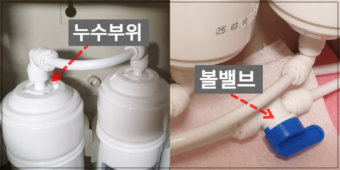- 조리수 밸브를 잠그고 볼밸브도 잠근 후 다시 조리수 밸브를 열면 원래 물이 안 나와야 한다.