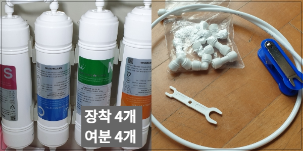 - 교체할 필터 4개를 순서대로 입수꼭지에 끼워 통수 작업을 했다.(구매 사이트에서 상세히 알려줬다)