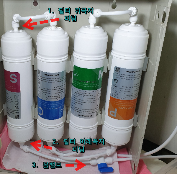 - 수도 1번필터입수-1번필터출수->2번필터입수->2번필터출수->3번필터입수->3번필터출수->4번필터입수->4번필터출수->조리수밸브->정수된 물