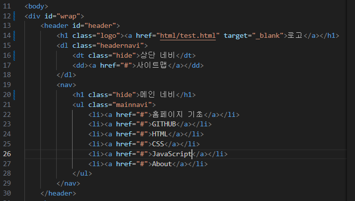 우선 16라인의 상단 네비와 20라인의 메인 네비는 코드상에서만 보면 된다.