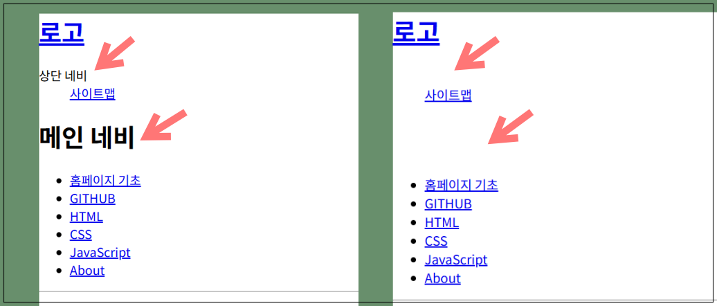 위 이미지를 보면 왼쪽의 상단 네비와 메인 네비라는 글자가 오른쪽을 보면 사라졌다.