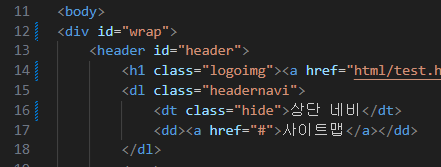 15번 라인의 class="headernavi"가 13번 라인 id="header"에 포함된 자식 요소다.