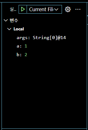현재 지역(local, 로컬) 변수 a = 1, b = 2가 할당되었음을 알 수 있습니다.