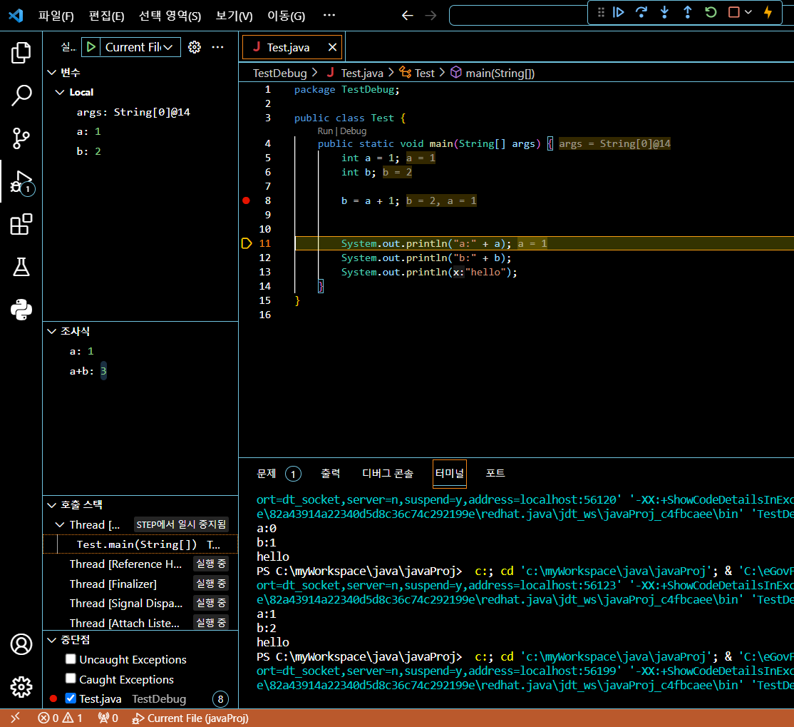 호출 스택은 현재 Test.main에서 실행됨을 보여줍니다. 복잡한 프로그램인 경우 현재 어떤 모듈이 실행 중이고 어느 위치에서 중단점이 걸렸는지 확인할 수 있습니다.