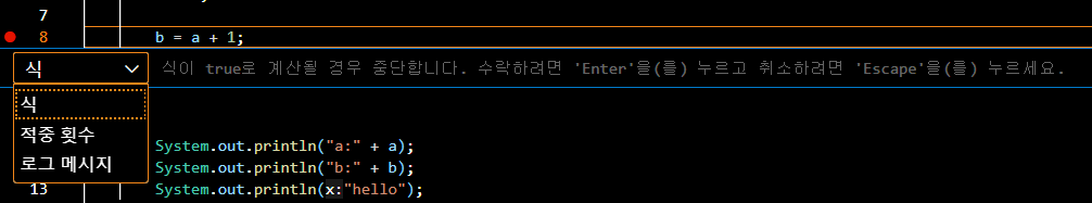 중단점 편집은 위 이미지처럼 식, 적중 횟수 로그 메시지의 옵션을 사용할 수 있습니다.