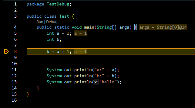 다음 라인으로 이동하니 8번 라인 옆에 b = 2가 할당되었음을 보여줍니다.