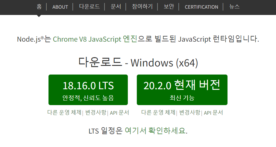 LTS와 현재 버전으로 받을 수 있는데요. 최신 기능을 가진 현재 버전보다는 안정적이고 신뢰도 높은 LTS 버전으로 선택합니다.