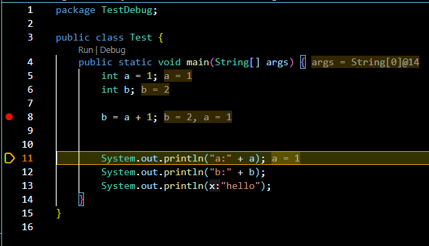 호출 스택은 현재 Test.main에서 실행됨을 보여줍니다. 복잡한 프로그램인 경우 현재 어떤 모듈이 실행 중이고 어느 위치에서 중단점이 걸렸는지 확인할 수 있습니다.