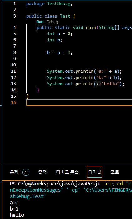 그리고 11~13번 라인은 a, b와 문자열 hello를 출력하고 있습니다.