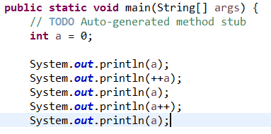 주목할 점은 ++a는 1을 증가한 뒤 출력을 하고 a++는 증가 전 값을 출력한 뒤 다음 a값을 보면 증가되어 있다.