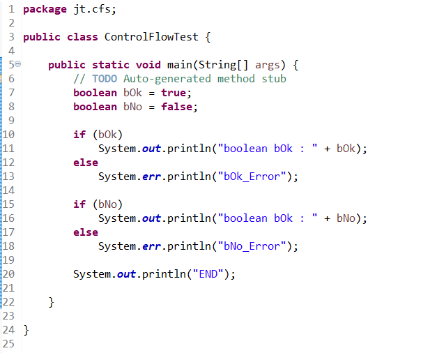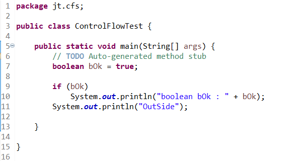 이 예문에서는 if 문의 bOk값은 true이므로 if 문 내의 구문인 System.out.println(“Boolean bOk : + bOk); 를 실행한다. 그리고 그 다음 구문도 실행해서 결괏값은 “Boolean bOk : true” 와 “OutSide”가 출력된다.
