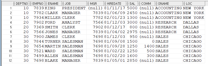 다른 점은 연결 컬럼인 DEPTNO를 명시적으로 표현하지 않았고 알아서 자동으로 연결된다는