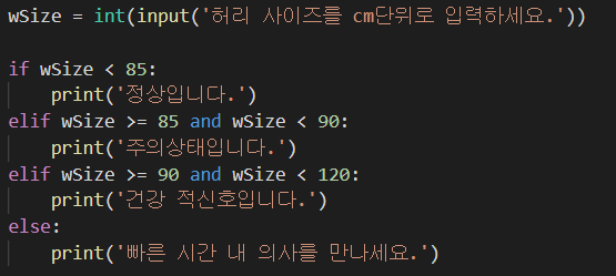 허리 사이즈를 입력 받고 해당 wSize의 값에 따라 print하는 값이 달라집니다.