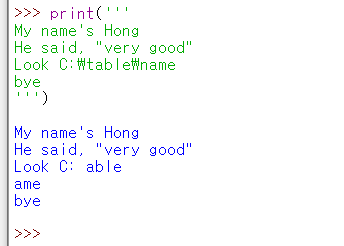 결과는 문자열 내 ' 또는 "는 잘 적용이 되지만 특수문자\는 그대로 실행이 되네요.
