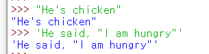 문자열 내 '를 사용하고 싶다면 "문자열"로 묶어주면 됩니다.